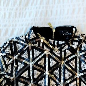 A never-worn black and gold sequin mini bodycon dress that has a comfortable stretch and a flattering fit.