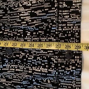 Shimmer in style with this stunning black and silver sequin bomber jacket. It buttons at the bottom. Has dolman sleeves with button cuffs. This will make a statement wherever you go!