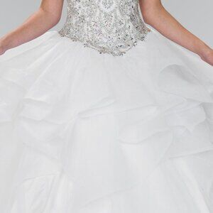 Long Formal Evening Dresses with illusion neckline, sequin bodice dress, cut-out back with corset closure, ballgown shape.