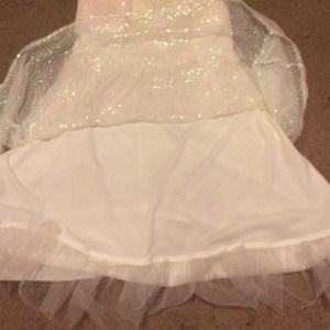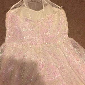 White sequin dress with shear neck line and strong tie back and zipper. Knee length, slight volume at the bottom of the dress. This dress can be worn to prom and any other fancy event. Goes great with white shoe. Yes this price is tangible.