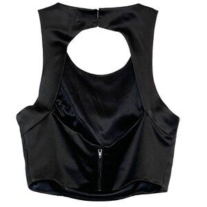 The top is black, form fitted, scoop neck, sleeveless, keyhole back, sewn in pads in the bust area, fastened at the neck with hook & eye and at the waist with a zipper.