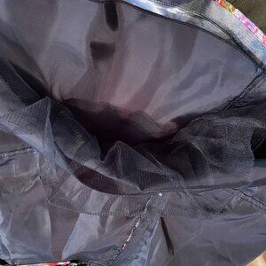 The multi-colored floral skirt has a fitted waist band with a zipper closure in the back, box pleats, has a medium to heavy weight interface (crinoline) on the hem to hold the shape, It's fully lined and has and an additional two layers at the bottom, one with a flounce of netting.