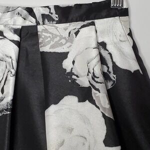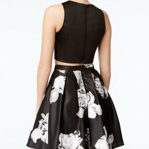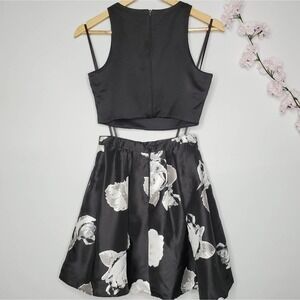 Features : hidden back zipper at top and skirt, black crop top, floral A-line skirt, molded cups at bust, fit & flare, layered skirt with tulle, prom