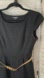 A-line fitted and flare style mini dress in black with tan stripes across bottom. Features simple thin belt, cap sleeves, squared neckline, side zip closure, and textured slightly stretchy fabric.