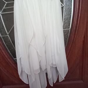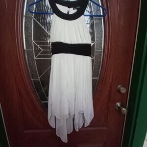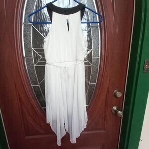 Beautiful dressy white dress, round solid black neckline, solid black pleated waist band (front only), below waist line layered, shorter in front, sleeveless, lined, machine wash cold, material 100% Polyester; approx measurements: armpit to armpit 13"shoulder to hemline back 32", center front 22".