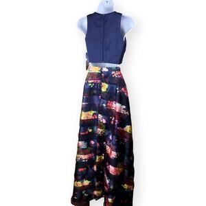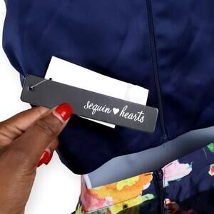 Sequin Hearts Juniors Navy Floral Formal Ball Gown 2-pc 1. NWT. Navy satin sleeveless crop top, back zipper. A-line floral chiffon floral, full-length skirt. Sheer panel shirt, navy, pink, floral.
