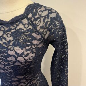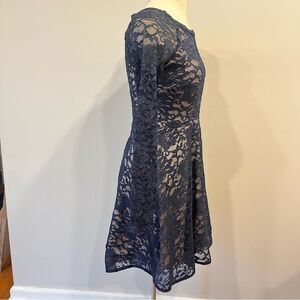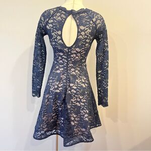 Sequin Hearts Navy Lace Overlay Sheer Keyhole Back Fit & Flare Dress Size 5