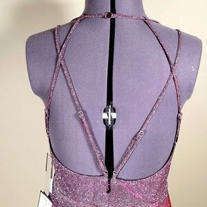 Pink sparkly fit & flare strappy mini dress from Sequin Hearts. Zip up the back closure with snap at neck. Adjustable straps. Content: 100% polyester. Care: hand wash, dry flat.