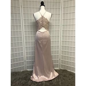 Beautiful excellent used condition Sequin Hearts Satin Blush Lack Back Gown with slit size juniors' 5. Used only once and was hand washed afterwards. No signs of wear, only some very small marks on the dress that are not noticeable (pictured). Has a sweetheart neckline, Back zipper closure, crocheted lace at back with cutout and thigh-high slit at front hem. Perfect for prom, pageants, or any black tie event!