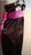 Black & white floral bodice, wide, flattering fuchsia sash at empire waist line; sexy skirt with side hip slash pockets.