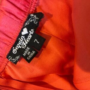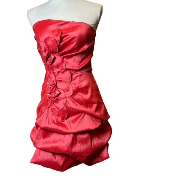 Sequin Hearts Women's Formal Coral Taffeta Mini Dress 7 Excellent condition. See photos for details and measurements. Deep coral color. silicone strip at upper bodice to stay in place. Flowers and rhinestone details. Great for prom, sorority, formal, wedding, gala, ball