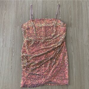 A sequin mini dress featuring a straight-cut neckline and back, adjustable cami straps, back concealed zipper, tulip hem, and bodycon silhouette.