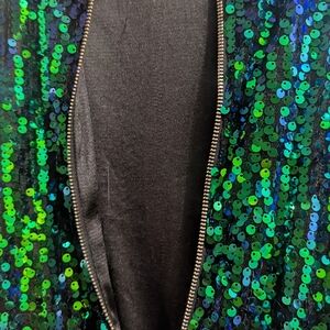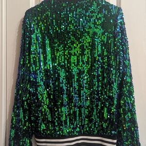 Dazzling sequin bomber jacket with vibrant green and blue hues. Perfect for making a statement. Worn once.