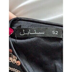 The garment is lined for comfort and has a zip closure at the back. The sequin accents give it a glittery touch, perfect for a holiday or clubwear theme. This one-piece jumpsuit is available in size L 12/14 and is made of a polyester and spandex blend. Dry clean only.