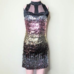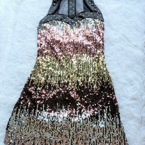 Gorgeous, ombre sequin halter mini dress with built in boy shorts. Super sparkly with multicolor sequins, spandex trim and mesh yoke over attached shortall. Dancers Dress!