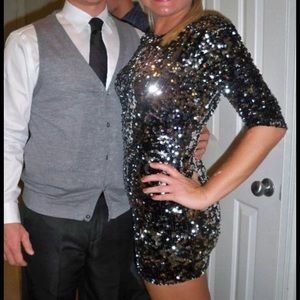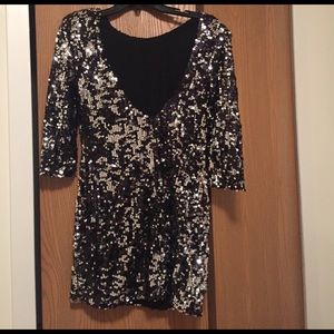 Black and Silver Sequin Party Dress. Open back. Full front. 3/4 Sleeves. Worn once. Like new.