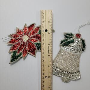 Sequin Poinsettia and Silver Bell Fabric Christmas Ornament