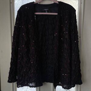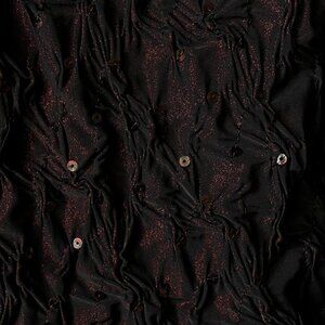 Very pretty unique fabric. It is stretchy, moderately sheer, and gathered in a scrunchy fashion throughout. There are 2 pieces: a wide-strapped tank top and an open-faced jacket. Both are the same material, but the tank top has an inner lining so it is not see-through, and the jacket does not have an inner lining making it more sheer.