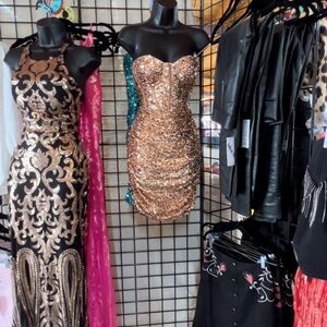 Shine in this stunning strapless gold dress, perfect for any special occasion. The shimmering sequins add a touch of glamour.