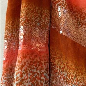Stylish scarf with sequin accents. Features vibrant orange and brown stripes.