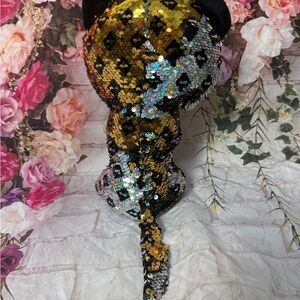 Adorable sequin leopard plush with striking blue eyes. Features shiny gold and black sequins with a touch of white and pink accents.