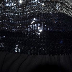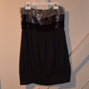mini dress featuring black, silver, and slightly blue tinted sequins at the top with a wide band at the bottom. perfect for new years :)