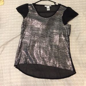 Silver sequins on front with sheer black back and sleeves. Never worn. Great condition. No sequins have fallen off.