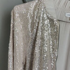 This sequin bomber is so fun! Champagne color, soft interior and so sparkly! EUC ...worn once. Size S.