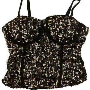 NWOT and no defects. Size small black corset top with beautiful sequins and adjustable shoulder straps. Very cute! Armpit to armpit 14 1/2” and centerback length is 8 1/2”. Tote 17.