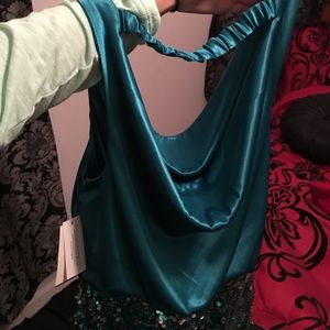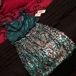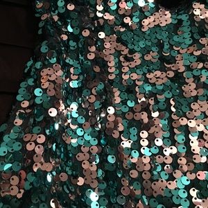 Turquoise/greenish dress with sequins on bottom, drooping chest with open back