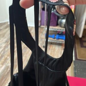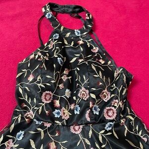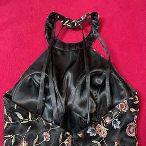 hooks at neck and has 4 satin like straps in back. has a zipper back