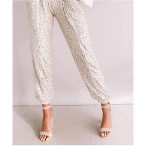 Elevate your wardrobe with these stylish sequin joggers by Muche & Muchette. The beige color adds a touch of elegance to the regular size pants. The joggers are designed for women and feature a beautiful sequin accent that makes them stand out. The pants are perfect for any occasion and can be dressed up or down. They are made of high-quality material that ensures that they are durable and long-lasting. These joggers are a must-have for any fashion-conscious woman who wants to add a touch of glamor to her wardrobe.