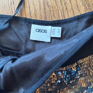 Knee length black skirt with dark gold sequins. Subtle and chic. Slim fitting, side zip. Great condition.