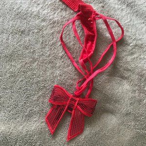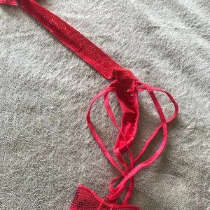 Velcro collar neck. Bow on back of booty. Ties in back for the breast part. This is for a woman with D cup breasts at the very least I'd imagine, otherwise I don't think it will cover the nipples. Size small but a tight fit for taller women.