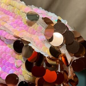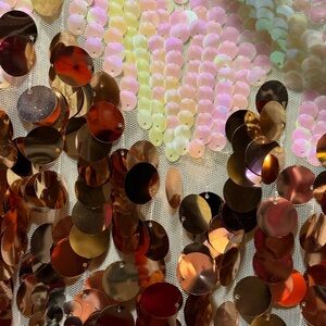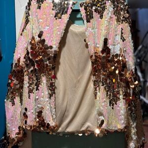 Sequin top that can be worn as an open back shirt or a top button jacket. Very versatile, super cute, and bold with a touch of old money sophistication. Size shown is IK sizing, which translates to a US 22.