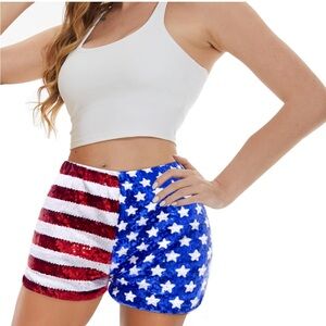 Women's Sequins Shorts for Women, 4th of July Shorts Women Stars and Stripes Shorts, Sequin High Waisted Shorts, Memorial Day. With glasses and beads