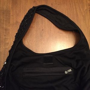 Black slouchy shoulder bag. Stretchy, comfortable, two Velcro tabs to keep closed at the top, single zipper pouch inside. Sequins are a fun way to dress up an outfit or it can be used as part of a costume!