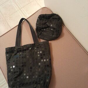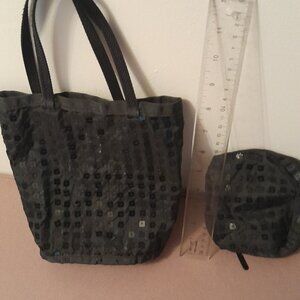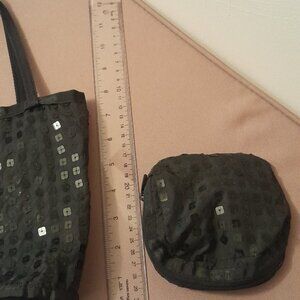 This is a small taffeta/sequin tote bag great for proms/weddings or evening bag. Bag is open with no closure and measures 8"h, 7"w, 2 1/2"deep. Bag comes with a matching sequin zippered separate pouch 5" x 5".