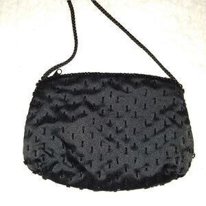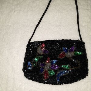 Black sequin and beaded bag. Colorful sequins on on the front. Beaded on the back. Has silk rope strap. Satin inside lining. Can be worn with strap or as a clutch.