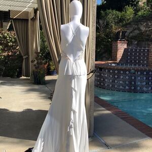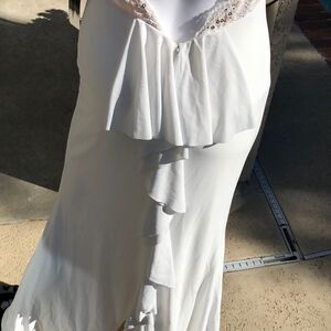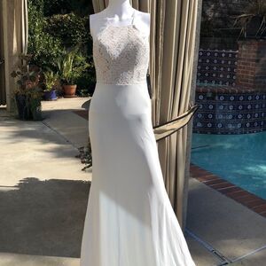 NWT This elegant gown is highlighted with a crisscross strappy open back and sparkling sequin lace bodice with a jersey skirt. A ruffle back detail adds the perfect finishing touch to this head-turning piece.