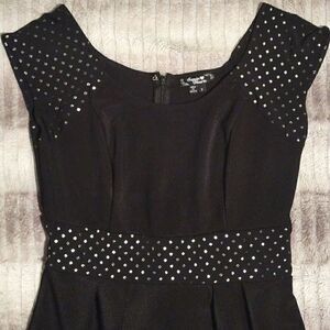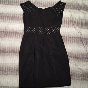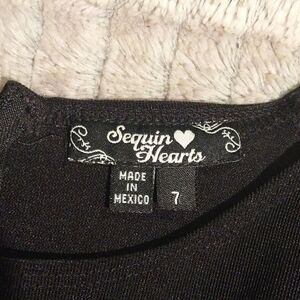 This Sequin Heart Black Dress is a Junior size 7. It has silver square studs on shoulders and around waist. Zips up the back (see photos).95% polyester 5% spandex and machine washable. Pre-owned and in excellent condition.