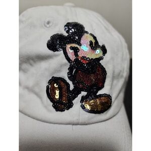 To subtly let the world know you have style, try on this white baseball cap for size. The sequined Mickey Mouse decal will show off your fashion sense and your love of the classics.