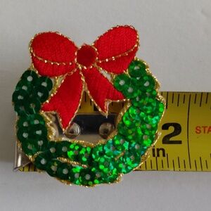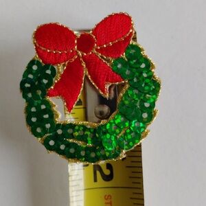 Bundle of 10 Decorative Wreath embellishments Wreaths are Green Sequins and the Red bows are embroidered Perfect touch to add to a shirt, coat, bag, Also could be used on holiday crafts or packages Size: 1.75" across x 1.75" tall New! Never used Smoke/free & Pet/free home