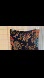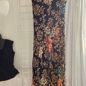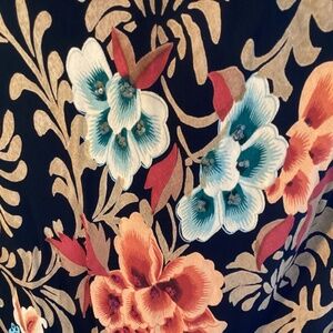 This romantic, long, floral print skirt has orange, tan and blue flowers on a black background. Fully lined. Drawstring waist is 37 inches at max. 100% rayon. Length 44". Hips 45" Sequins scattered on select flowers. Medium.