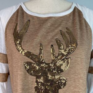 Super fun long sleeve top featuring a gold sequin reindeer design on the front. It measures 20 inches armpit to armpit when laying flat and it’s 22 inches in length from the shoulder to the hem.