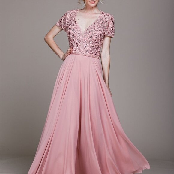 Long Formal Evening Dresses with illusion v-neckline, short sleeve sequined dress, sheer back with zippered closure, a-line shape.