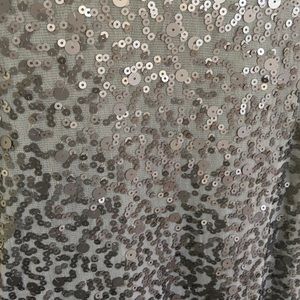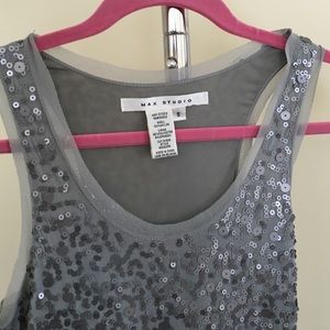 Max Studio gray/silver sequined dress. Perfect for Girls Night Out! Top features tank-style fit with sheer detail around neckline and arms. Fitted throughout. I'm 5'2 and it hit just to the knee.