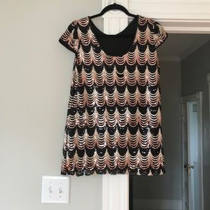 Black, silver, gold, and rose gold sequined ultra-mini dress; lined. At 5'2, this dress hit me mid-thigh. Made by Romeo + Juliet Couture.