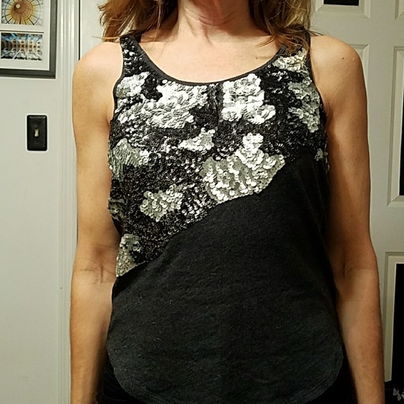 Cotton / Modal blend Racerback tank with sequined bodice. Sequins are in black, gray, silver.