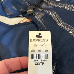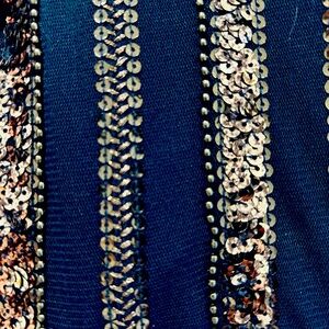 Navy blue fine gauge tulle racerback tank top with liner. Decorated with dark silver/pewter sequins and beading. Both tank and liner stretch. Hand-wash.